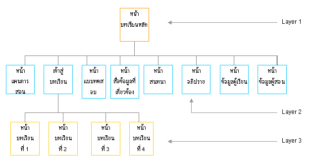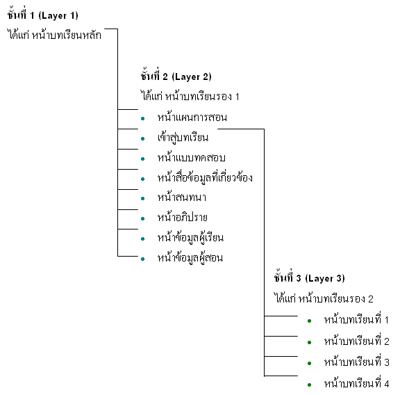 รูปแบบโครงสร้างเวปแบบลำดับชั้น (Hierarchy) ที่นำมาปรับเป็นโครงสร้างของ Web-Based Instruction จากภาพนั้น จะเห็นได้ว่าโครงสร้างเวปแบ่งได้ 3 ลำดับชั้นด้วยกัน แผนภาพต้นไม้ เราสามารถเขียนเป็นแผนภาพต้นไม้ (Root Tree) ได้ดังนี้
